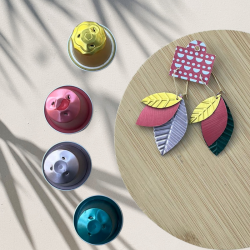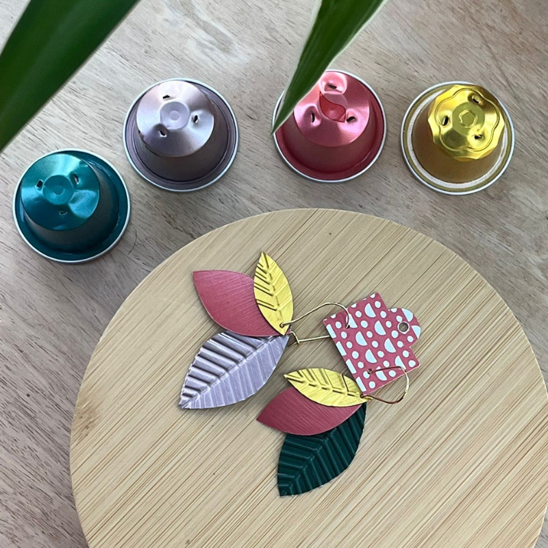 Cette paire est réalisée avec 4 capsules différentes en aluminium dans des tonalités assorties grâce aux nombreuses couleurs de capsules qu'offrent les marques Nespresso ou café royal.