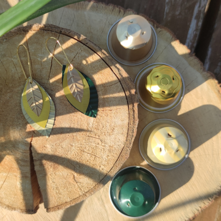 Cette paire est réalisée avec 4 capsules différentes en aluminium dans des tonalités assorties grâce aux nombreuses couleurs de capsules qu'offrent les marques Nespresso ou café royal.