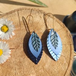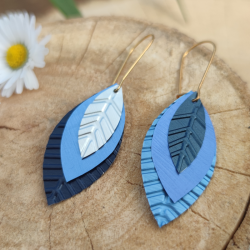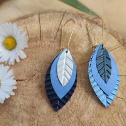Elles sont modulables : la plus grande feuille comporte 2 couleurs différentes dans 2 tonalités différentes (bleu très foncé au recto et bleu au verso). Vous n'avez qu'à choisir le côté qui vous plaît le plus selon vos envies ou vos tenues. Ainsi, vous avez plusieurs boucles d'oreilles en une seule paire ! A vous de composer !